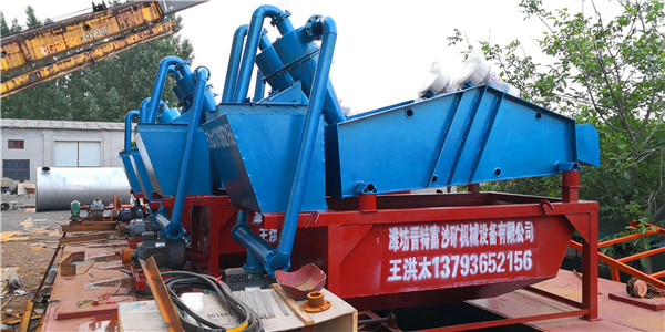工作過程:泵將砂水混合物輸送至旋流器,離心分級濃縮的細砂經沉砂嘴提供給振動篩,經振動篩脫水后,細砂與水有效分離,少量細砂、泥等經返料箱再回到清洗槽,清洗槽液面過高時,經出料口排出。直線振動篩回收物料重量濃度為70%-85%。調節(jié)細度模數可通過改變泵轉速、改變砂漿嘗試、調節(jié)溢流水量、更換出砂嘴來實現。從而完成清洗、脫水和分級三種功能。